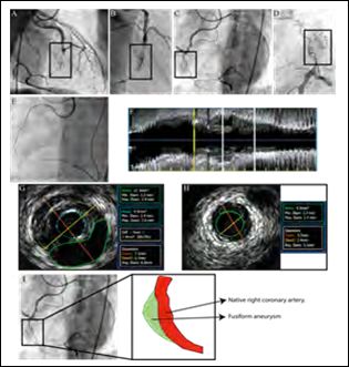 Figure 1: A-D. Evidence of contrast retention in the mid-RCA with a close-up angiog- raphy identifying a contrast retention area (true lumen vs. chronic coronary dissection or aneurysm). E. CART reverse technique was used to approach the chronic total oc- clusion. F-H. IVUS showed a fusiform apparently three-layer wall true aneurysm and lumen diameter 7 mm (orange line). I. Fusiform aneurysm diagram (green) on the native vessel (red).