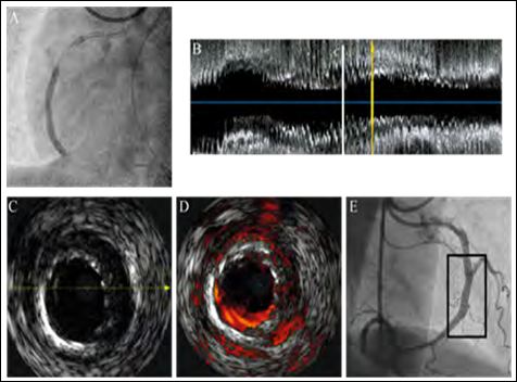 Figure 2: A. CTO was treated successfully with two DES without vascular complica- tion and fusiform aneurysm was apparently isolated. B-D. Final IVUS with successful- ly treatment of the CTO and the fusiform aneurysm with chromaflo confirmation. E. Good angiographic result.
