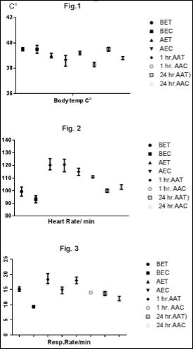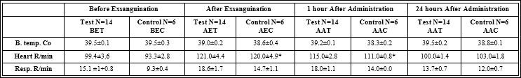 The recorded changes in certain physiological variables After Exsanguinations (AE) and 1 hour post infusion (1 hA) were slight hypothermia and marked tachycardia in both groups (Table 1 & Figures1-3).