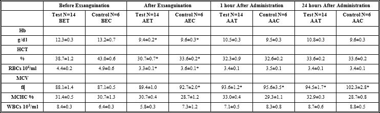 Moderate exsanguinations were followed by significant reduction (P<0.05) in the measured values of Hb, HCT and RBCs, while calcu- lated values of MCV showed significant increase (P<0.05) post-exsan- guinations and infusion. The WBCs count showed mild changes in both groups at all time points (Table 2).