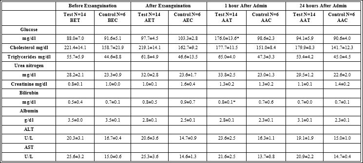Table 3: Blood chemistry variables before and after exsanguinations and 1 hour and 24 hour after administration of CHBOC (Test) and HES 200 (Control) (Mean±SE).