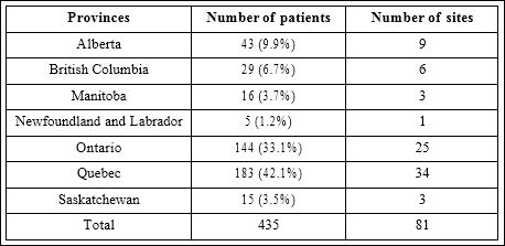 A total of 435 patients (60% male) who were 74.4±10.9 years old were recruited by 81 physicians from all provinces from February to October 2014 (Table 1). The average duration of AF was 5.6±5.0 years with permanent AF being most common (38%) followed by persistent AF (31%) and paroxysmal AF (29%); in 2% the AF had not been classified. Prior history of stroke was present in 11%, TIA in 10%, and non neurologic systemic embolism in 2%. Prior rhythm management included cardio version in 9%, ablation in 5%, and 73% were on anti arrhythmic medication. The most common co morbidities were hypertension (72%), smoking (39%), coronary artery disease (34%), diabetes mellitus (30%), congestive heart failure (20%) and peripheral arterial disease (9%). Prior history of major bleeding was documented in 5% of patients, liver disease in 2%, stage 3 chronic renal disease (eGFR 30-59ml/min) in 38%, stage 4 chronic renal disease (eGFR <30 ml/min) in 5%, and heavy alcohol consumption (>10 drinks/week) in 2.5%. Review of current medications revealed 59% use of beta blockers, 55% use of lipid lowering therapy, 32% use of an angiotensin converting enzyme inhibitor, 23% use of an angiotensin receptor blocker, 29% use of a diuretic, 15% use of a calcium channel blocker, 5% use of amiodarone, and 5% use of sotalol.