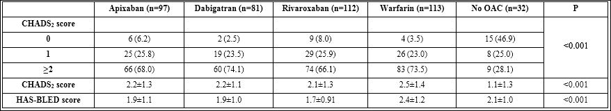 The average HAS-BLED score of patients receiving warfarin was greater than that of patients receiving one of the newer direct oral anticoagulants (p<0.001; Table 2). In 43 patients with a HAS-BLED score >3, 19 patients (44%) received one of the newer direct oral anticoagulants, 20 patients (47%) received warfarin, and 4 patients (9%) received neither.