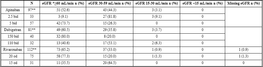 The use of specific newer direct oral anticoagulants and their dosages as a function of renal clearance is shown in table 3 and these were mostly consistent with the product monographs. None of the patient with an estimated Glomerular Filtration Rate (eGFR) below 15 mL/min received a NOAC, but some patients with an eGFR below 30mL/min did. For apixaban, where a combination of two out of three characteristics (age ≥80 years, weight ≤60 kg, creatinine >133 µmol/L) warrants a lower dosage, no patient received a dosage over that which was recommended.