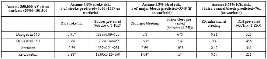 We assumed that there were 350,000 patients with non valvular AF based on the estimated prevalence of 1% in the general population [11]. We further assumed that those on warfarin (29% or 101 500 patients) with CHADS₂ scores ≥1 would benefit to a greater degree from treatment with one of the newer direct oral anticoagulants as recommended by the CCS AF guidelines [4]. Using the average CHADS₂ score from our study of 2 (translating into a 4% annual risk of thromboembolic events) and using a 3.3% annual risk of major bleeds and 0.75% annual risk of intra cranial bleeds, we calculated the annual frequency of these events in these 101 500 Canadian non valvular AF patients [8-10]. With these assumptions we estimate that if patients were not treated with an anticoagulant there would have been 4060 strokes each year related to non valvular AF, which would have been reduced to 1339 strokes (a 67% relative reduction) if these patients were treated with warfarin [12]. The 101 500 patients treated with warfarin would experience 3349 major bleeding events per year of which 761 would be intracranial bleeds. If the CCS recommendations were followed and one the newer direct oral anticoagulants were used rather than warfarin, the results of RE-LY, ROCKET-AF and ARISTOTLE would predict that up to 455 strokes, 1038 major bleeds, and 525 intracranial hemorrhages could be prevented each year in Canada (Table 4) [8-10].