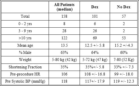 Dexmedetomidine was administered in 101 procedures. In 80 of these, Dexmedetomidine was administered as both a bolus and an infusion. In 19 procedures, it was administered as an infusion alone and twice only a bolus. Other sedative agents were used in addition to Dexmedetomidine in 60 cases (Table 3). Pre procedure blood pressure and shortening fraction were similar in procedures where Dexmede- tomidine was administered compared to those where it was not. In the Dexmedetomidine group, the mean age was lower (12.5 yrs vs. 15.2 yrs, p=0.001) and the mean pre procedure heart rate was higher (108 vs. 99 bpm, p=0.001) (Table 2).