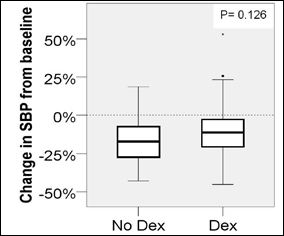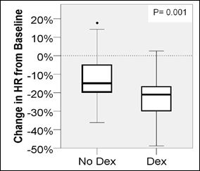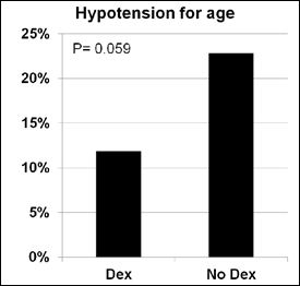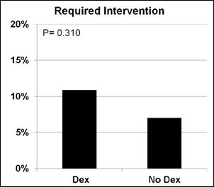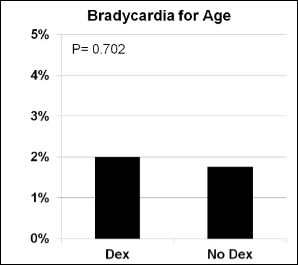 A decrease in heart rate greater than 20% from baseline was more likely when Dexmedetomidine (p=0.001) was administered. The incidence of receiving an intervention (p=0.310), bradycardia for age (p=0.702), hypotension for age (p=0.059) or decrease in blood pressure greater than 20% from baseline (p=0.126) was similar in procedures with Dexmedetomidine compared to those without (Figures 1-5).