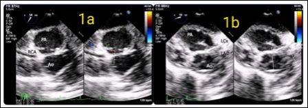 Preoperative trans-thoracic echo revealed d-TGA with large subpulmonic VSD and small OS-ASD. Additional basal muscular VSD was seen. Child was taken up for ASO. After induction of anaesthesia as per institutional protocols, Transesophageal Echocardiography (TEE) was done using a Philips S8-3t transesophageal probe and iE33 workstation. On mid-esophageal aortic valve short axis view at an omniplane angle of 60°, pulmonary artery was posterior and to the right. Aorta was anterior and left. The right coronary artery was coursing from the right coronary sinus towards the right ventricle without any branching (Figure1). Left coronary artery was coursing to itsbifurcation at an omniplane angle of around 20°, indicating the two coronaries were not in the same plane (Figure 2).