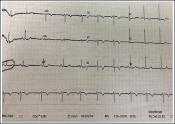 Figure 1: Preoperative electrocardiogram revealing normal sinus rhythm with anteroseptal T wave inversion.