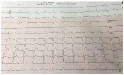 Figure 2: Electrocardiogram during the episode of chest pain revealing complete LBBB with a HR of 78 bpm.