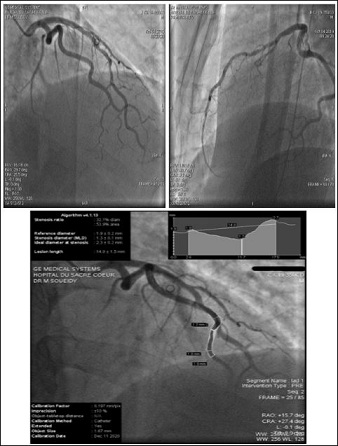 ECG was immediately obtained, it consistently showed (LBBB) during chest pain episode (Figure 2). Patient was started on aspirin 325 mg, loading dose of Ticagrelor 180 mg, heparin drip, and was subsequently taken for emergent coronary angiogram. The coronary angiogram showed a 50% non obstructive atherosclerotic plaque of the mid-LAD (Figure 3), calculated using Quantitative Coronary Angiography (QCA). A trial of intracoronary nitroglycerin fails to relieve the stenosis as well as the chest pain, which may argues against vasospastic mechanism of his pain .The lack of availability of IVUS or FFR in the catheterization laboratory is a limitation step. A high sensitivity cardiac troponin value turned negative for 2 sets. Echocardiogram showed normal left ventricular ejection fraction without any regional wall motion abnormalities.