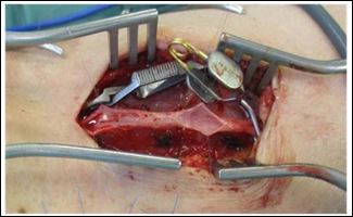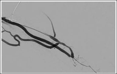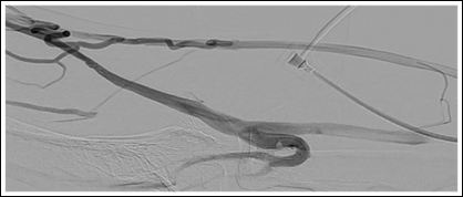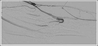 Figure 1: Retrograde access to the cephalic vein of the forearm showing the stenosis of the anastomosis and the two draining branches.