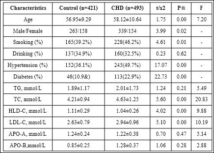 Methods: This study involved 914 subjects with 493 CHD patients and 421 healthy controls. The genotype distribution of these SNPs was analyzed and their relations with CHD risk factors were assessed.