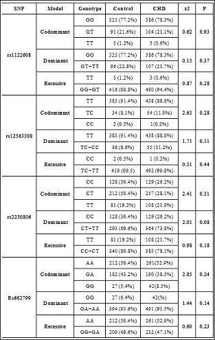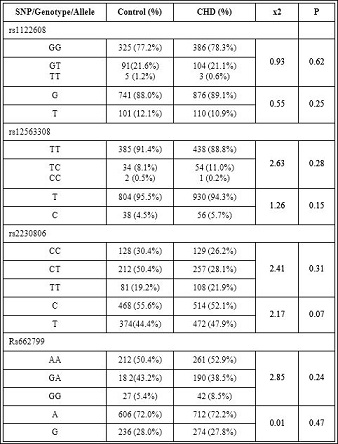 Table 2: Genotypic and allelic distributions of SNPs between control and CHD group (P>0.05).