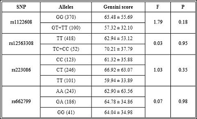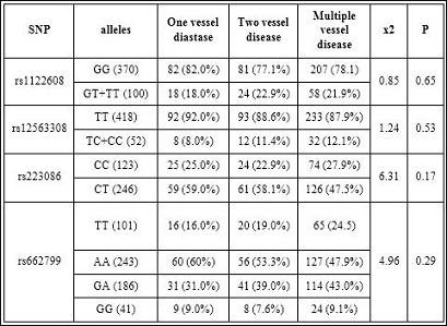 Table 7: Effect of SNPs on angiographic severity of CHD.